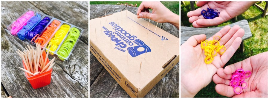 To start, poke as many toothpicks as you’d like (the fewer the more difficult) through a cardboard box. Let players pick what rubber band color they want and hand them out accordingly. Here are the two ways I have played this game (feel free to get creative and modify them as you’d like):